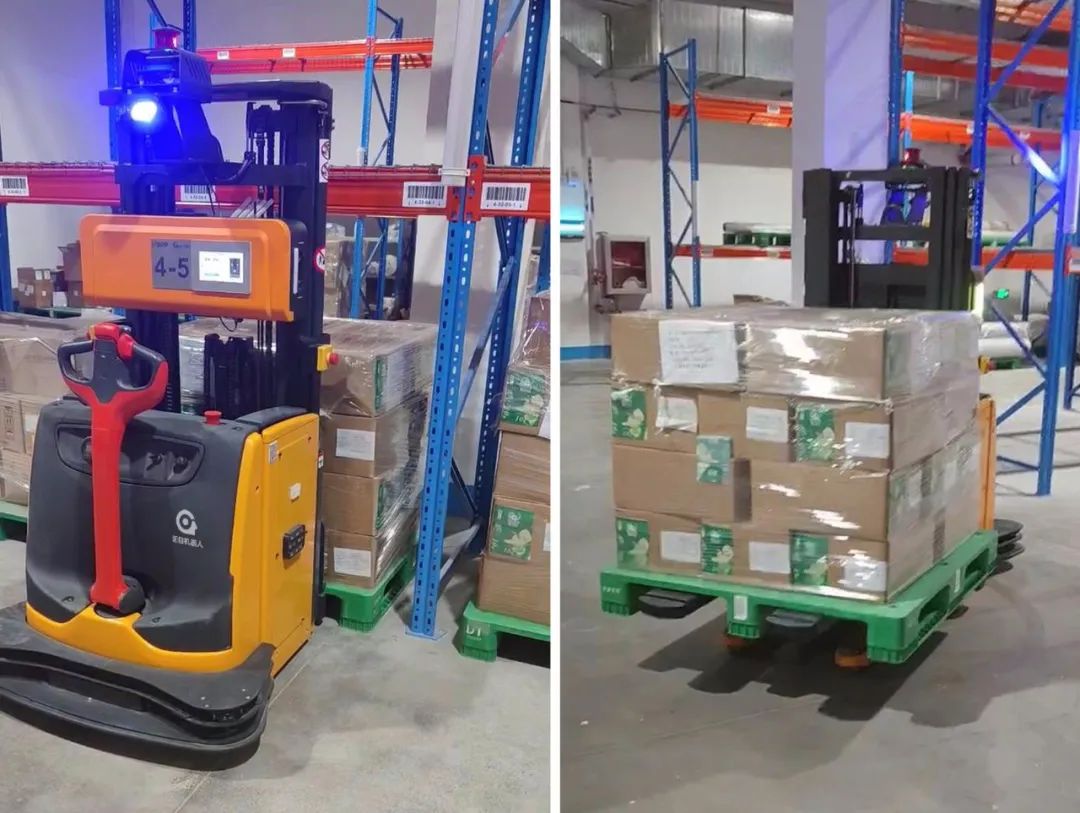当包装材料库收料时由人工叉车运至收料区再由AGV运送至货架或指定区域,完成自动发料时由AGV运送各类包装材料到机台指定存放点。