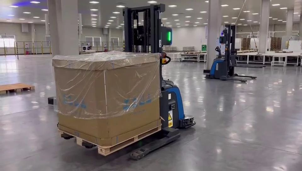 在打包车间,叉式堆垛AGV将空货架搬运指码垛区域,由机械臂完成烘干产品码垛,AGV在将满货货架搬运至输送线,进入下一个工序,实现用户3分钟空满交换的节拍要求。