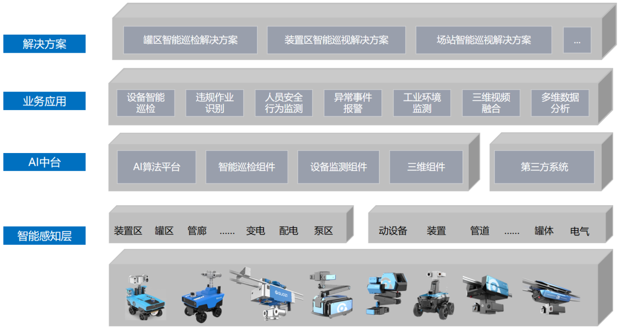 以防爆轮式巡检机器人与防爆挂轨巡检机器人为基础,与固定视频监控及特种物联网边缘采集设备联动,构建“空中地面相结合,动态静态相配合”的全方位、全空间的检测网络。对人员、设备、环境等多维度的物联网基础数据采集,通过大数据分析,实现满足LNG、油储、炼化、氯碱等细分行业的生产装置区、罐区、焦炉区的应用场景全方位巡检需求。